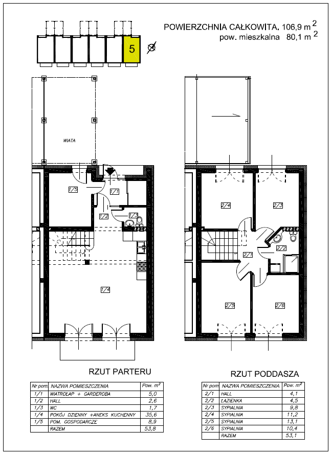 – 5 pokoi: 4 sypialnie: 13,1m2 , 10,4m2, 9,8m2, 11,2m2 i salon z aneksem kuchennym 35,6m2